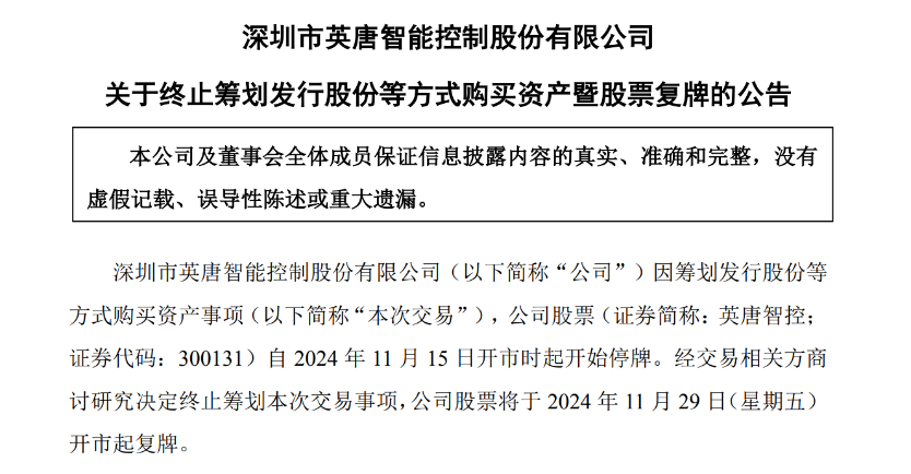 英唐智控在芯片领域的产业并购遭受侘傺。停牌两周之后体育游戏app平台,英唐智控拟收购深圳市爱协生科技股份有限公司(简称“爱协生”)的事项按下了“辩认键”。 11月28日晚,英唐智控发布公告,此前,公司拟通过以刊行股份及支付现款的方法获取爱协生的适度权,公司股票自11月15日起停牌。由于交往相干方未能最终就交往决议以及异日居品政策发展达成共鸣,各方决定辩认贪图这次交旧事项,公司股票将于11月29日复牌。